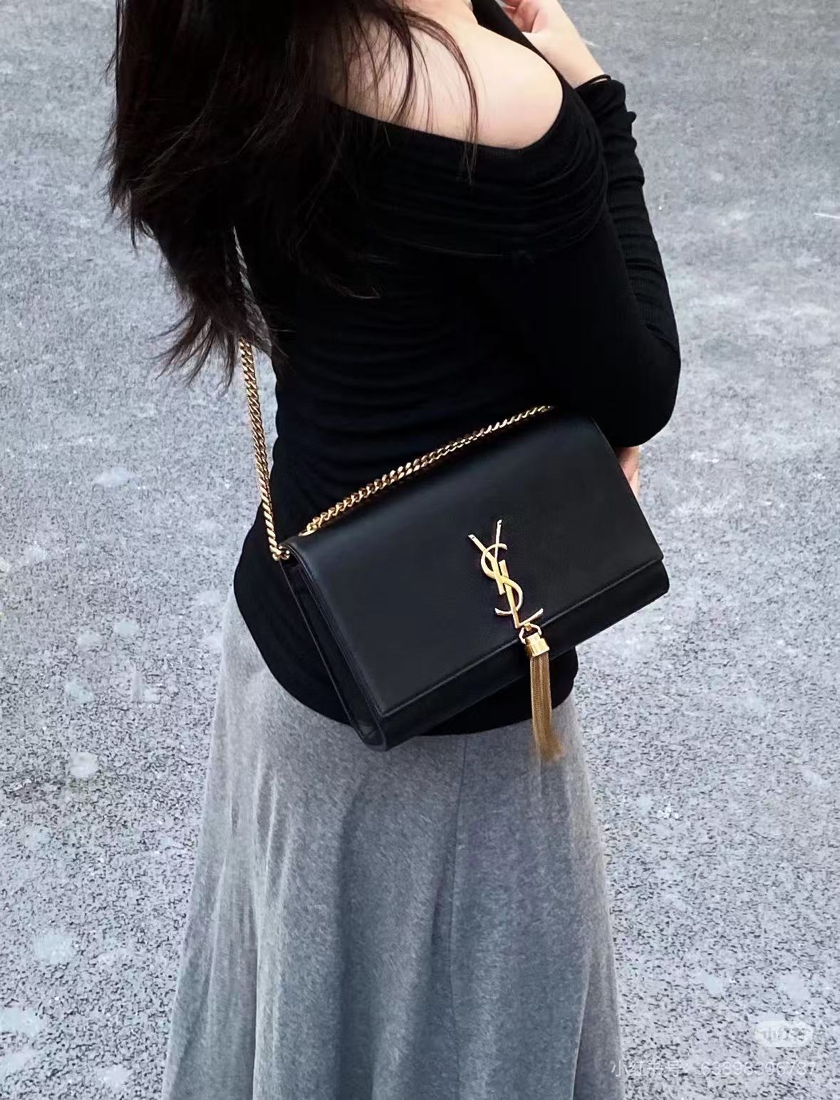 经典的黑色包身,搭配上细腻的皮革纹理,质感直接拉满。金色的YSL logo在黑色皮革的衬托下格外耀眼,瞬间提升了整个包的奢华感。而那垂坠下来的金色流苏,更是点睛之笔,随着步伐轻轻摆动,灵动又优雅,每走一步都像是在走时尚秀场
